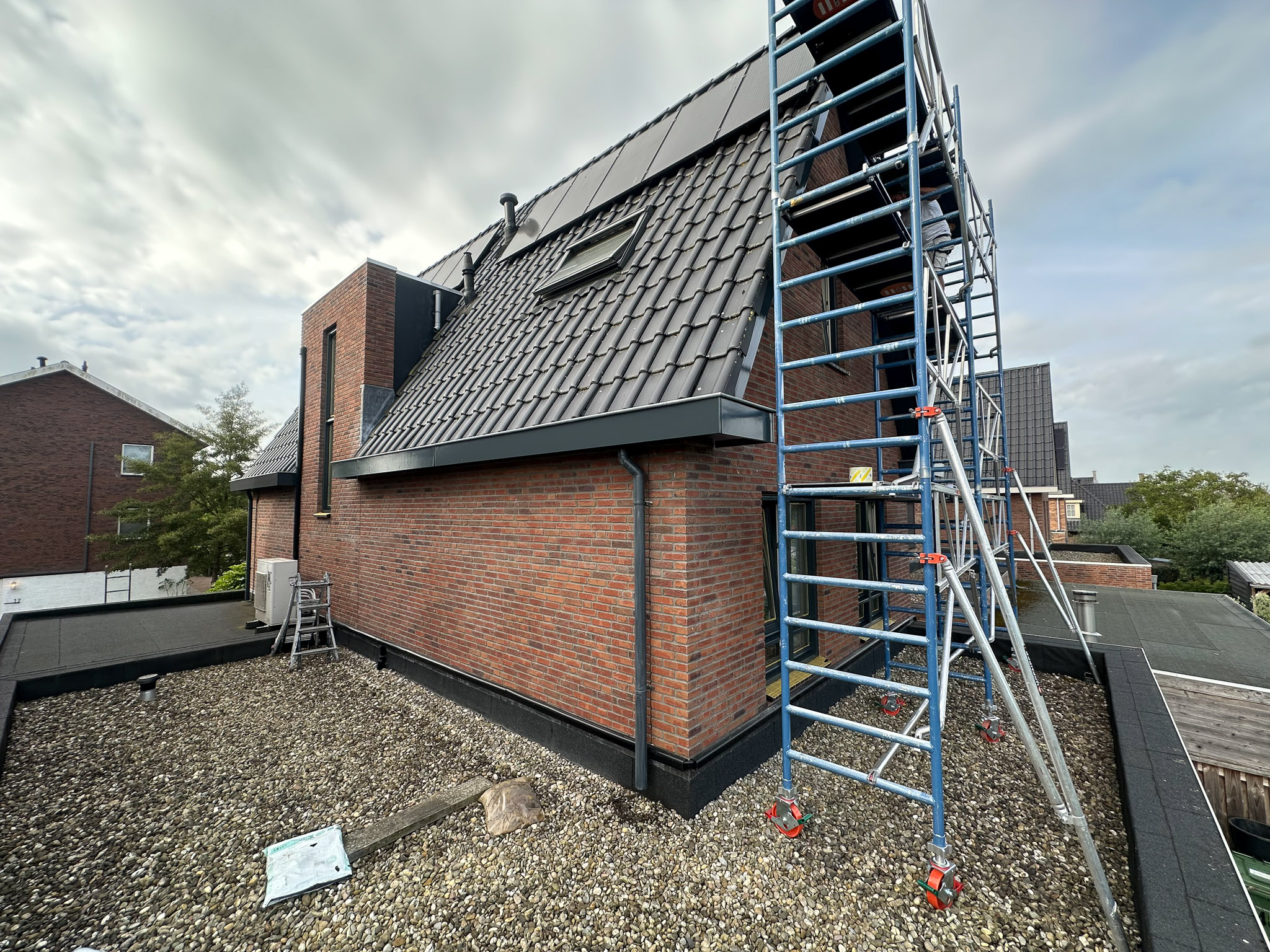 Het volledige houtwerk rondom de woning is volledig vernieuwd qua uitstraling. Waar eerder een klassieke witte tint werd gebruikt, straalt het geheel nu in het moderne RAL 7016 Antracietgrijs. Deze kleur geeft de woning een eigentijds en luxe karakter, dat perfect past bij de huidige woontrends in Schoonhoven en omgeving. Zelfs de hemelwaterafvoer is meegenomen in dezelfde kleurstelling, zodat er een strak en harmonieus totaalbeeld ontstaat. Dit is niet alleen mooi om te zien, maar draagt ook bij aan de waarde van de woning. Voor huiseigenaren die hun huis een moderne uitstraling willen geven, is dit type buitenschilderwerk een slimme en duurzame keuze.
